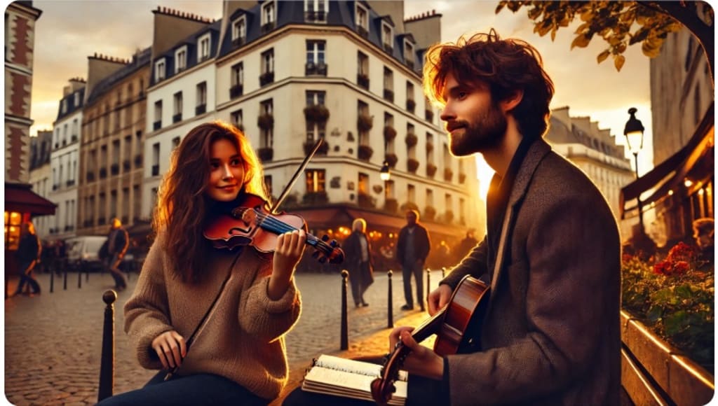 Over the next few days, Lena found herself returning to the square. Adrien was always there, his music filling the air with a bittersweet charm. Though they spoke different languages, they found ways to communicate. Adrien would play, and Lena would scribble in her notebook, occasionally showing him her sketches or notes. They exchanged smiles, laughter, and gestures that seemed to bridge the gap between them.