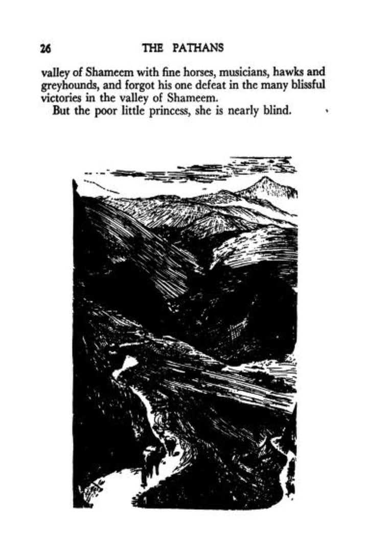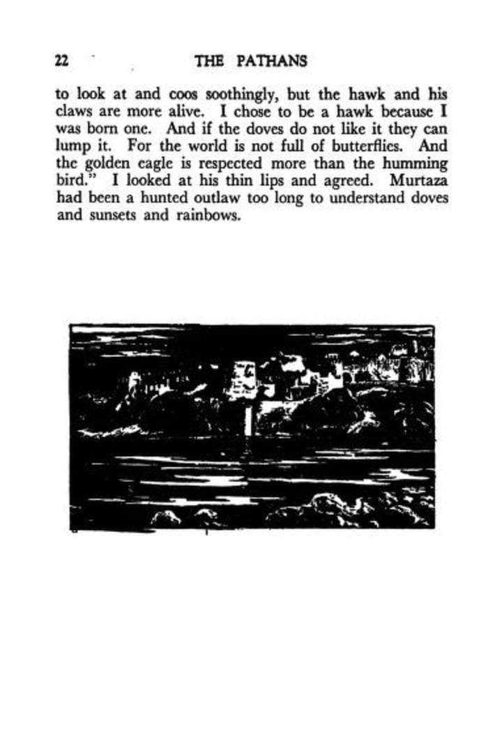 I want to talk about the Pathans, the people I love, which makes my task harder than ever. I want you to lcwe them as I do. But the Pathan is not easy to love. He takes a lot of knowing. His is a most complicated simplicity. I want to bring him down from the peaks of Khyber and the fields of Hashnager face to face with you—in his tom clothes and grass shoes, his eyes full of manliness, laughter and the devil, and his head full of a childish and noble pride—the chief camouflage he uses to hide his poverty and want. Yes, I want to bring him to you and make him talk to you—of his struggle and his dreams, of love and feuds, his field and his watchtower, his new rifle and his old wife.