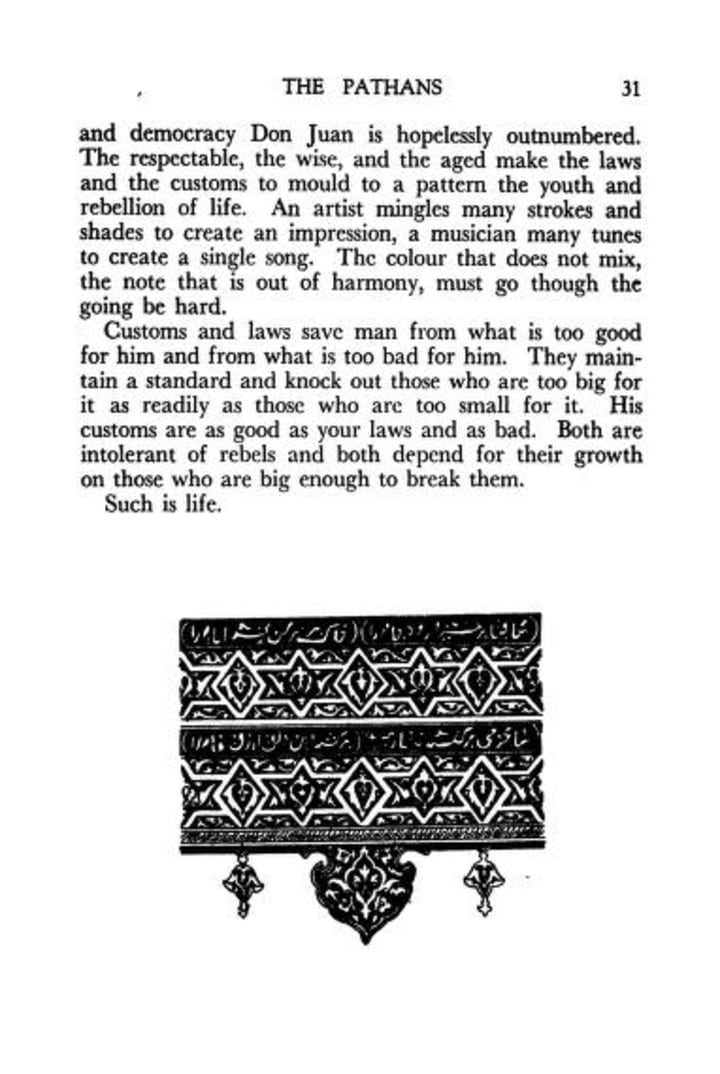 Now let us examine a few Pathan customs and try to see what they are driving at. For customs are the only tools with which primitive man carves the shape of his culture. It is a stroke of the brush in the hands of man the artist. It is not a stroke of lightning. It has a purpose, a will and a definite meaning, however awkward the shape. Let us take one of his most violent customs, which prescribes death for elopement or adultery. This ancient principle is active and living in the blood of the Pathan even today. It reacts violently when it clashes with the loose and generous ethics of the British-made law. The Pathan will shoot the seducer of his sister and walk proudly to the British-made gallows for it. The