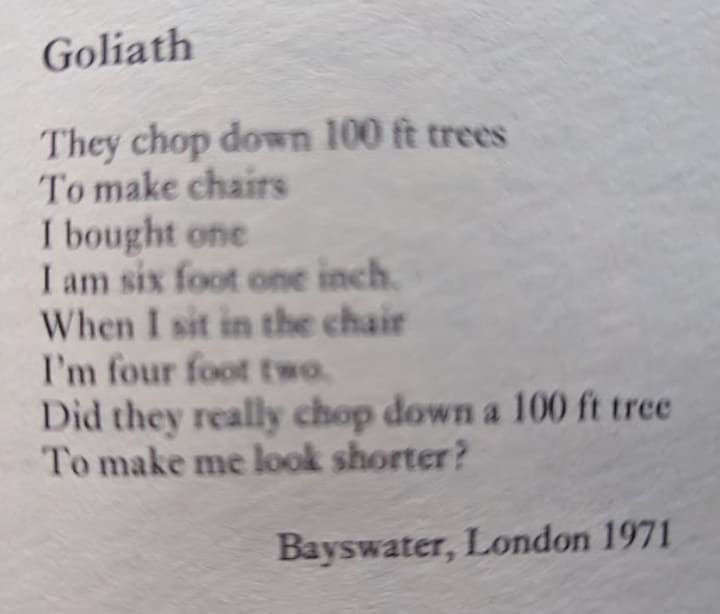 On the back of the book is the poem "Goliath", a great slice of comic observation, and you think this is going to set the tone of the book.