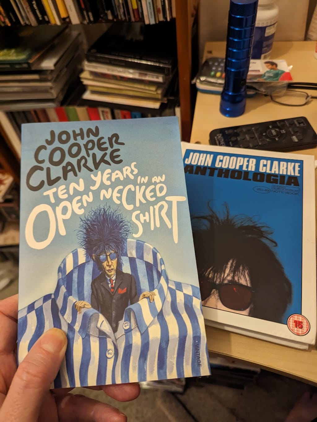 I was wondering where I would find a book with a blue cover, and for some reason was wide awake at three o'clock this morning and saw that a lot of my books had covers in various shades of blue, and John Cooper Clarke's book stood out almost saying "Choose Me!!".