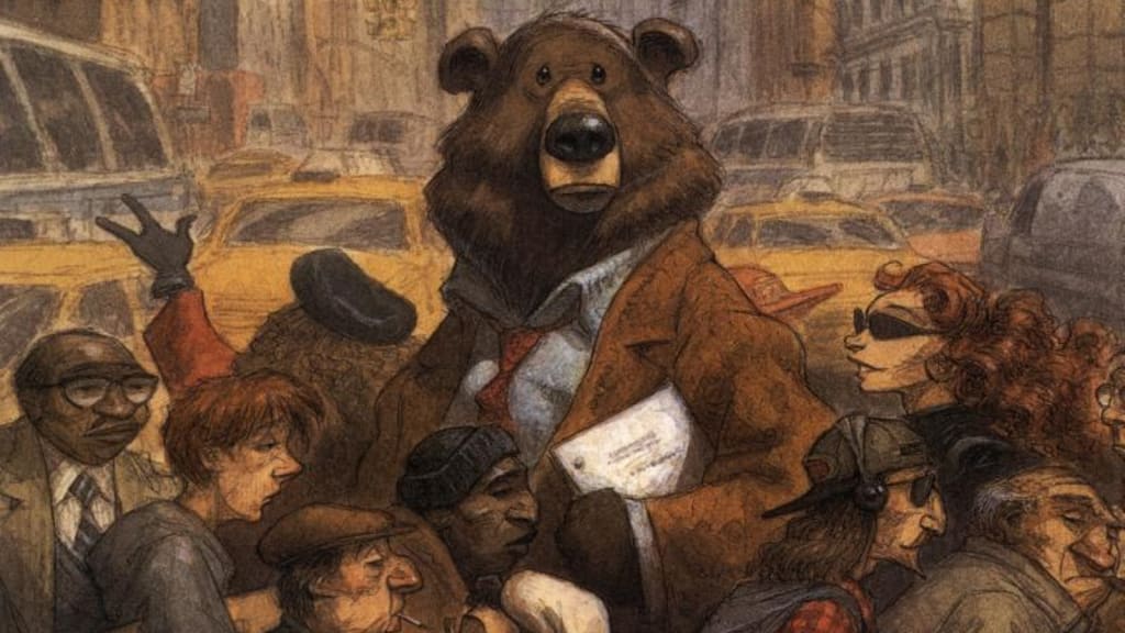 The Bear Went Over the Mountain is not a complicated story. An author loses his way, slinks into the woods with his dog, buries his latest manuscript, and finds himself out amongst nature. Meanwhile, a bear digs up the manuscript, decides it must be very important, takes it to the big city, and finds himself a critically acclaimed author amongst humankind.