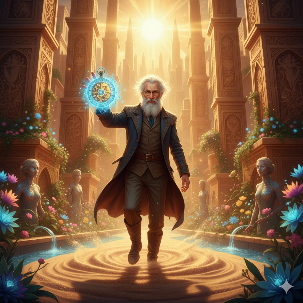 He found himself not in a sandy wasteland, but in a magnificent city bathed in the warm, golden light of a sun that seemed perpetually at noon. Towering structures of polished sandstone reached for the sky, adorned with intricate carvings of celestial bodies and mythical creatures. Water flowed through crystal conduits, nourishing lush gardens that bloomed with iridescent flowers. This was Aethel, not a ruin, but a vibrant metropolis, perfectly preserved in a temporal bubble.
