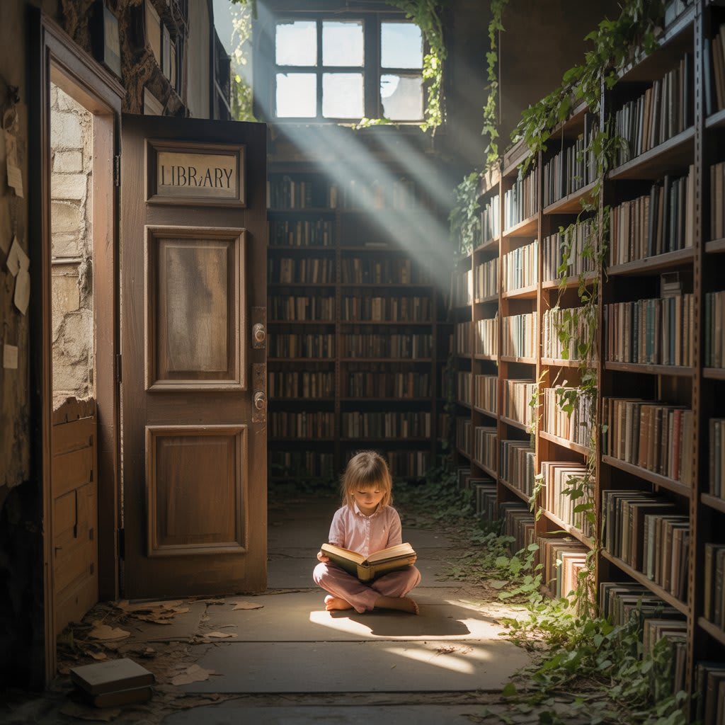 One afternoon, while wandering the forgotten edge of the city where construction projects had been abandoned, Mira noticed a door. It was hidden behind a wall of ivy and rusted fencing, a door older than anything she had ever seen—wooden, with peeling paint. A carved plaque above it read: Public Library.