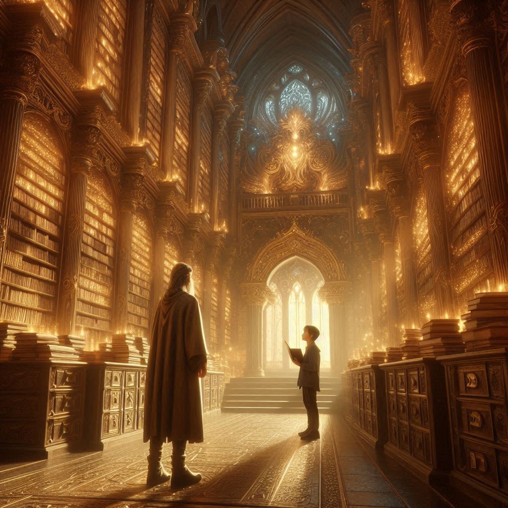 "Welcome to the Library of Dreams," he said, his voice low and soothing, like a gentle breeze on a summer's day. "I am the Keeper of the Books. We have been expecting you." His eyes, piercing green and filled with ancient wisdom, seemed to see right through to my very soul.
