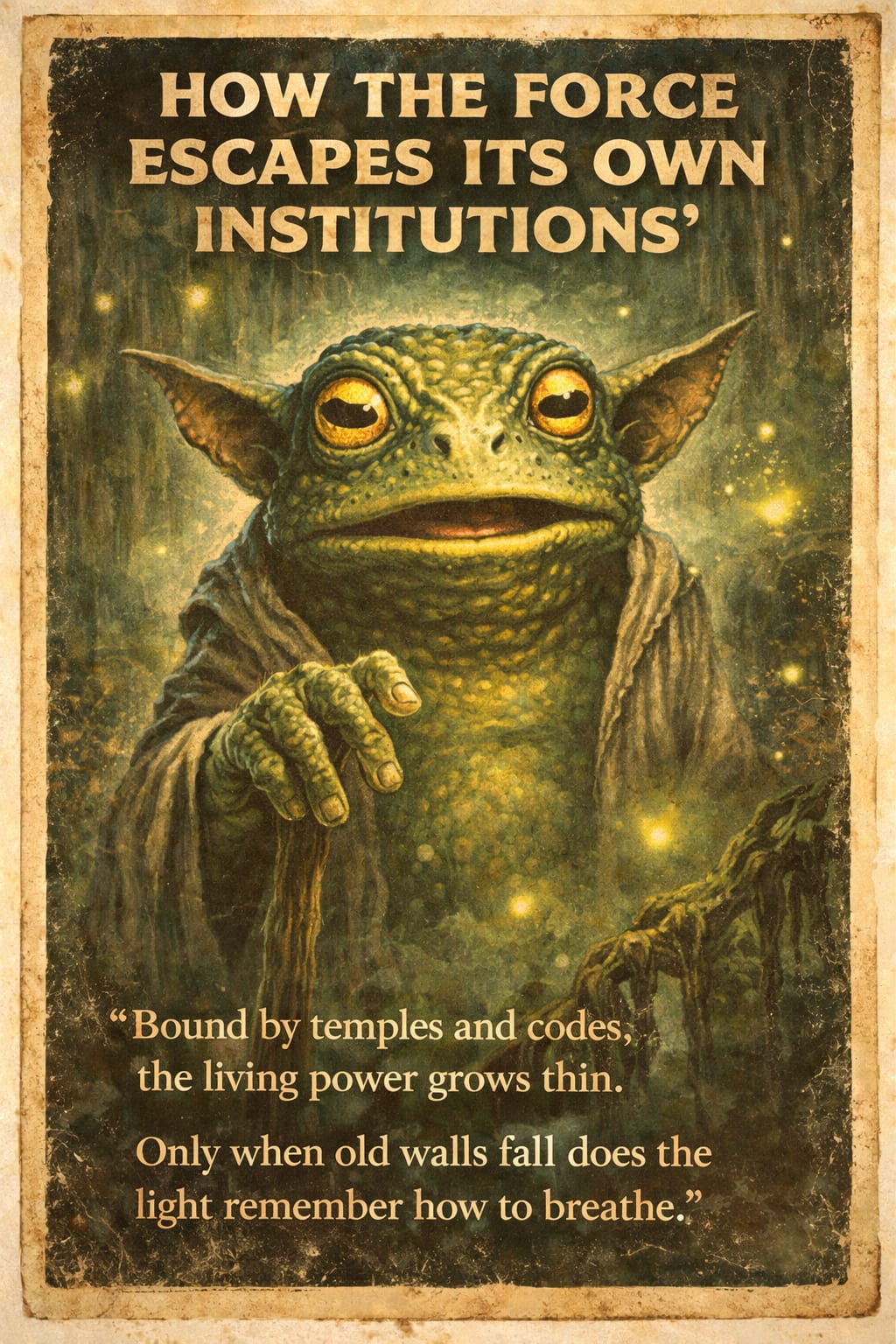 “Bound by temples and codes, the Force grows thin, for flow it must, not sit in stone. When orders cling to their names, blind they become to the living light. Only when the old walls fall does the Force remember how to breathe.”