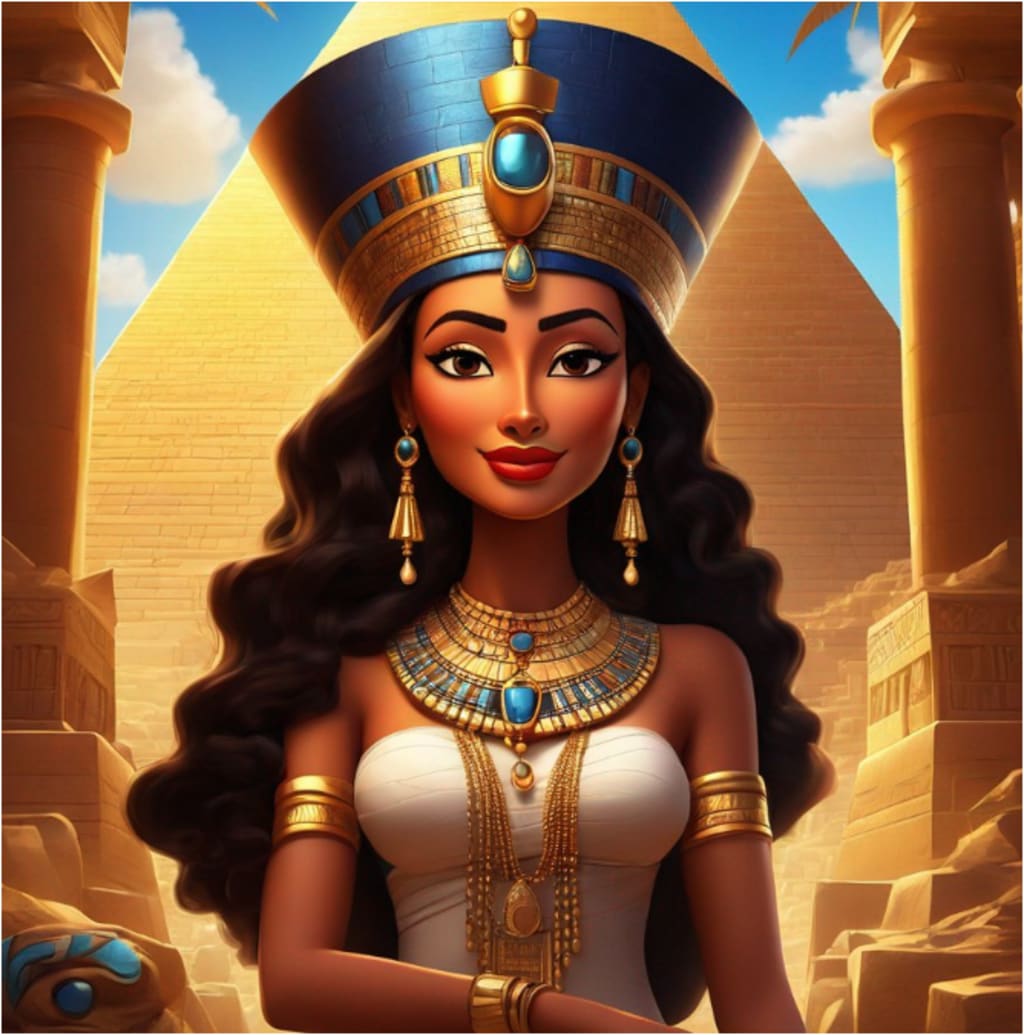 As Professor Pocket slid into ancient Egypt, he collided with a group of busy workers constructing a massive pyramid. The air was thick with the smell of incense, and the sun beat down upon his wild grey hair. A regal figure, adorned in golden jewelry, approached him. "Greetings, traveler from afar," she said, her voice like music. "I am Queen Nefertiti. We welcome you to our land."