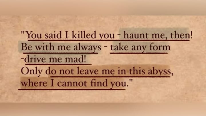 And this is the beggining of the love and hate relationship between Cathy and Heatcliff, full of "you are my true love but I can't stay with you" and "I hate you for abandoning me". There is also a desire of being wanted by your love, it's such a good book I love it!