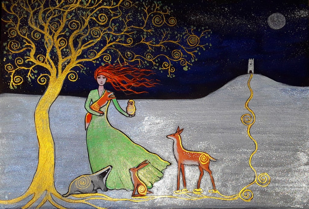 Her red hair flows as the gentle wind blows, under her golden tree and she brings forth new life to the world. The fox in her arms, and her wise owl perched on her wrist and at her feet, the badger, the rabbit and the deer.