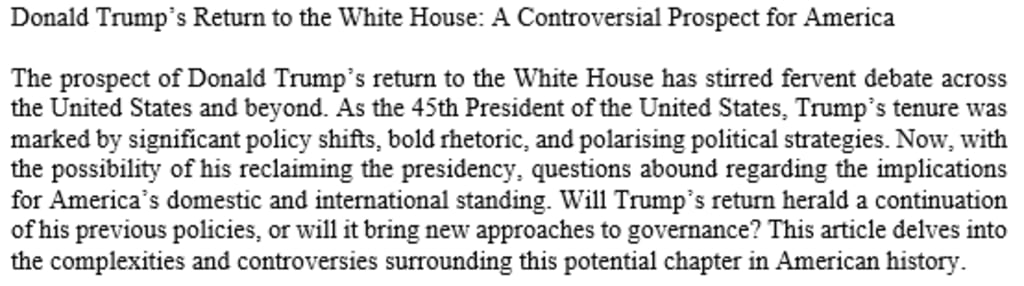 Donald Trump’s potential return to the White House represents a pivotal moment in American politics. It offers an opportunity to revisit and reassess the policies and leadership style that defined his first term while exploring new approaches to governance. For supporters, it symbolises a continuation of their vision for America. For critics, it serves as a call to action to defend the principles they believe are at risk.