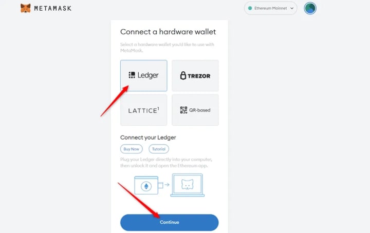 ● Wait for MetaMask to recognize your Ledger device, and click on Continue.