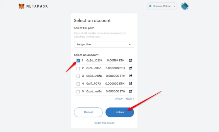 ● A list of accounts appears. These are your Ledger Ethereum accounts.