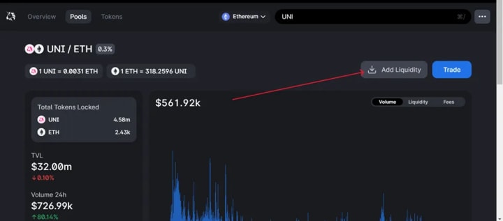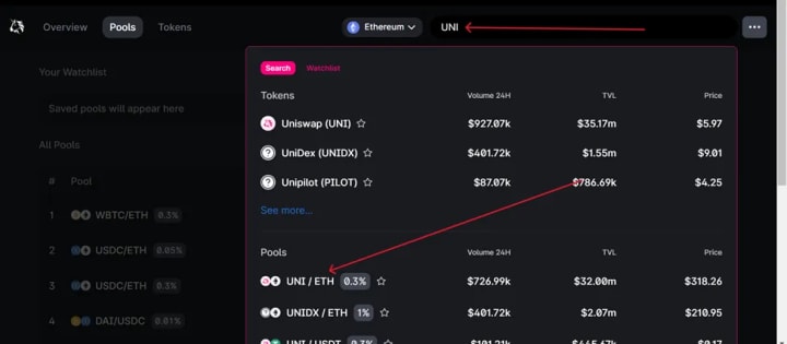 ● Enter UNI on the search box and choose a pair to add liquidity.