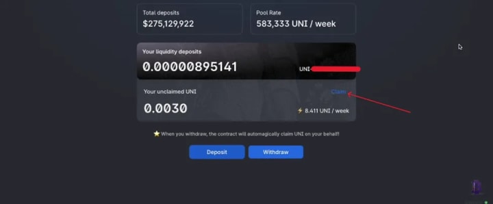● Click on pool liquidity. Scroll down and click on Claim, if there’s any available $UNI reward.