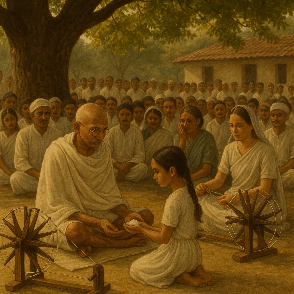 The whole ashram assembled, unbidden. Some brought spinning wheels; others carried baskets of coarse cotton or tools still streaked with soil. A few came with nothing but themselves — their eyes clear, their backs straight.