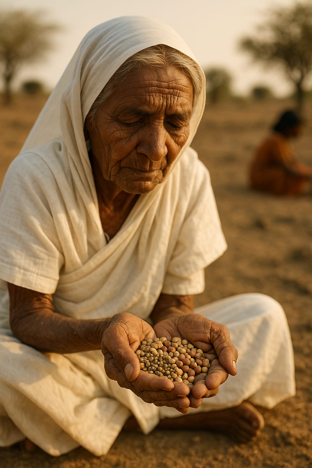 I did see. I saw the hunger, but not defeat. The calloused hands, but not idleness. The cracks in the earth, but also the careful bundles of seeds wrapped in cloth and stored with care. One woman, perhaps seventy years of age, stood and approached with a small pouch. From it, she poured into my palm a few rough, dry seeds — millets, lentils, pulses.