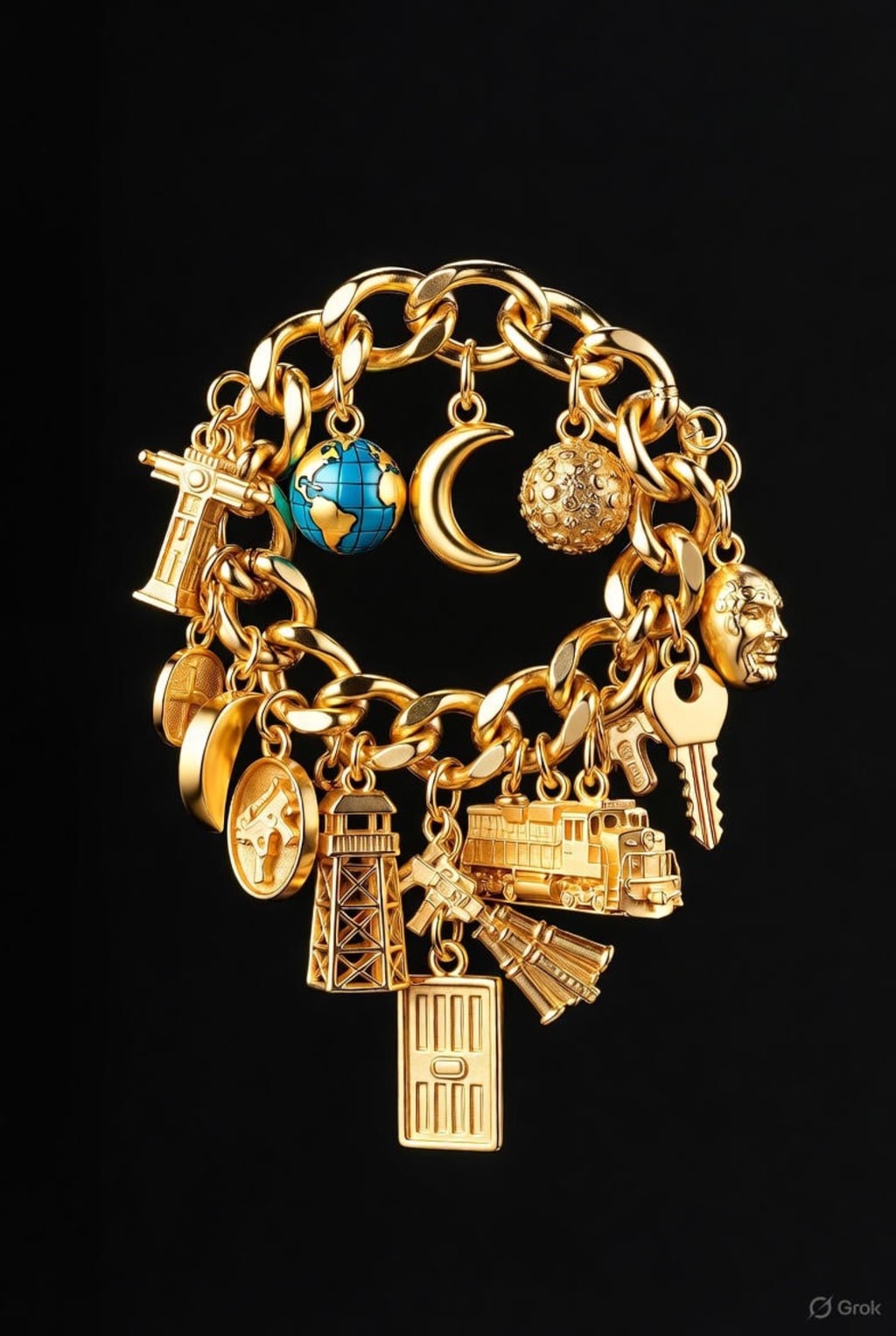 A tiny Earth. A crescent Moon. A freight slug. A dreadnought at sea. A border tower with its guns folded. A trade coin that vibrated faintly when you touched it. A book. A key. A door.