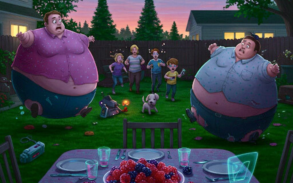Realizing what had happened, George, Paula, Arlo, and Crystal sprinted out of the house to chase after them and try to reverse the caloric catastrophe. Meanwhile, Buzz the dog darted happily in circles, thinking it was all some elaborate game of tag.