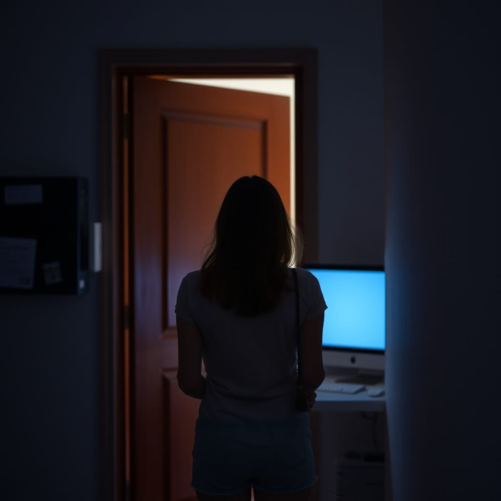 She opened the door. It was dark initially, but then, as she looked further, there was a series of dull lights. It was not daylight; if there was a window, it had been covered up. It was more like computers or TVs in standby mode.