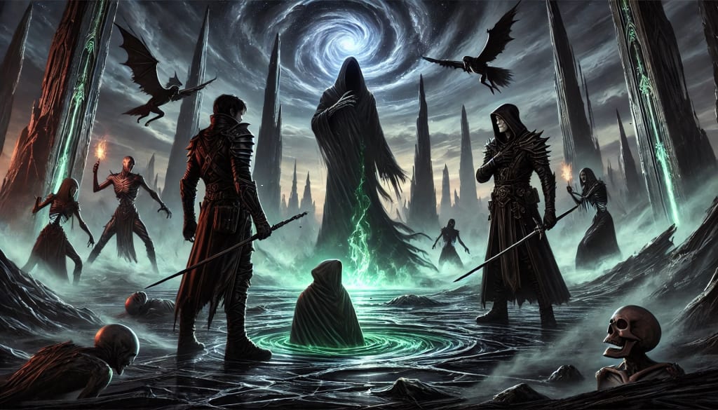 His form was wrapped in tattered robes, his face obscured by a hood. Shadows slithered around his limbs, as if he were made of the same darkness that filled this realm.