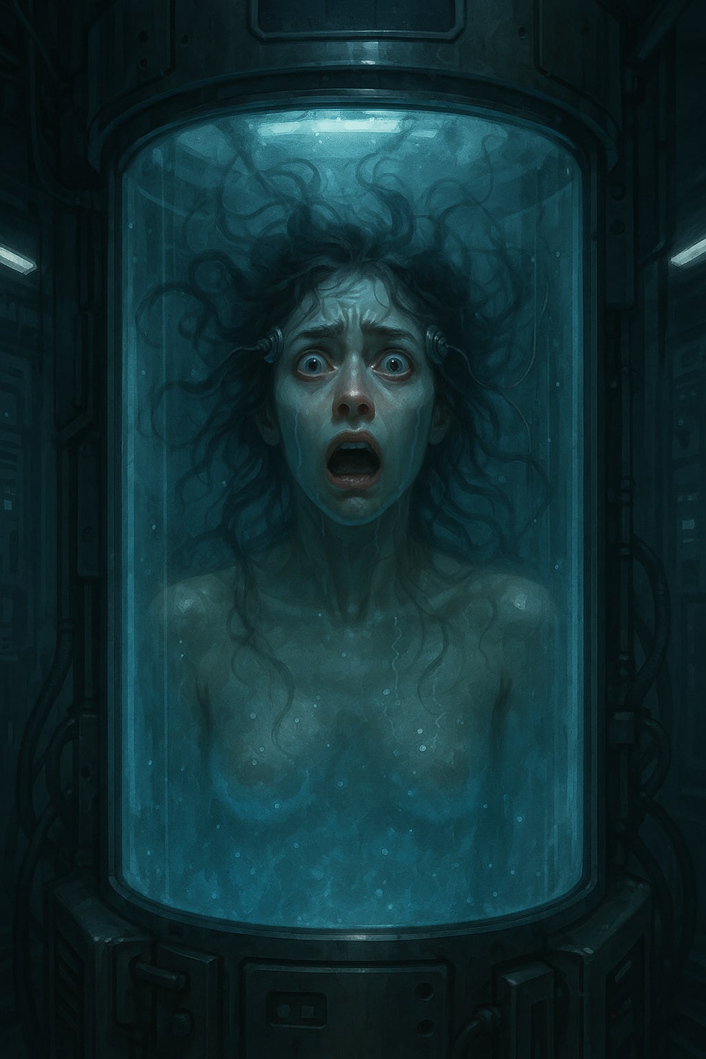 Then she found the door. Cold, pressurized. Her fingers brushed the control panel, and it let out a sigh. Inside, Wisp floated in a vertical stasis tank, her body slender, her hair drifting like smoke in water. Electrodes clung to her temples, feeding images into her dreams. A machine was talking directly into her subconscious.