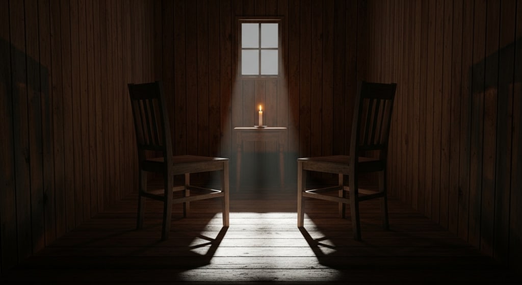 The room with the two chairs, the candle between them, the moonlight on the floor—that room exists everywhere. It exists in the space between two people who are willing to be real with each other. It exists in the moment when you decide to tell the truth. It exists in the heart of everyone who has ever carried a secret and longed to set it down. The invitation is always there. The chairs are always empty. The candle is always burning. The question is whether you will sit down, look across, and begin to speak.
