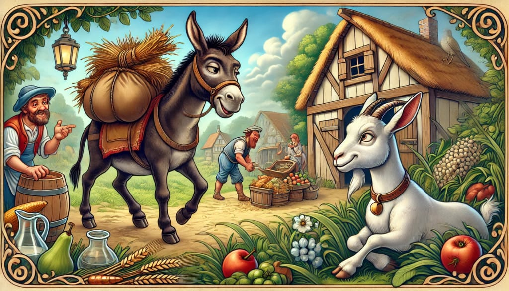 Driven by envy, the goat comes up with a brilliant plan of action to remove the donkey from his equation. He cons the donkey with feigned worry that the farmer is exploiting him while telling him to pretend to be ill to avoid work. The goat is behind this plot: he becomes forward as he aspires to take over the donkey's position and enjoy the expensive diet destined for him.