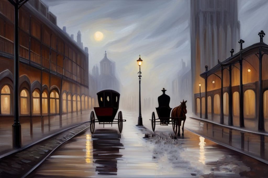 Duncan and Madeleine promptly left the inn and approached the steep metal stairs leading up to the elevated rail platform. Madeleine eyed them nervously, but Duncan held her hand as they ascended, allowing her to use both him and the steel railing for stability. Madeleine’s masculine clothing drew glances from the workers gathering on the platform. She ignored it, not being the wiser, but Duncan noticed fully well. He pretended not to see.
