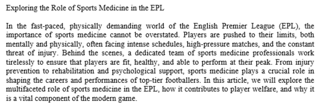 Sports medicine has evolved into a cornerstone of the modern football world, playing an indispensable role in the success of EPL players. From preventing injuries and rehabilitating players back to full fitness, to enhancing performance and supporting mental health, the contributions of sports medicine professionals are vast and varied. As the Premier League continues to grow in stature and intensity, the role of sports medicine will only become more crucial. With cutting-edge technology, expert knowledge, and a commitment to player welfare, sports medicine is ensuring that the stars of the EPL can shine on the pitch for years to come.