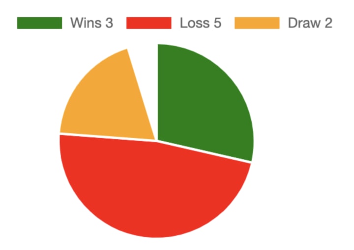 Fulham in their last 10 matche(s) have won 3 matche(s), whereas they have lost 5 match(s) and they managed to draw 2 match(s)