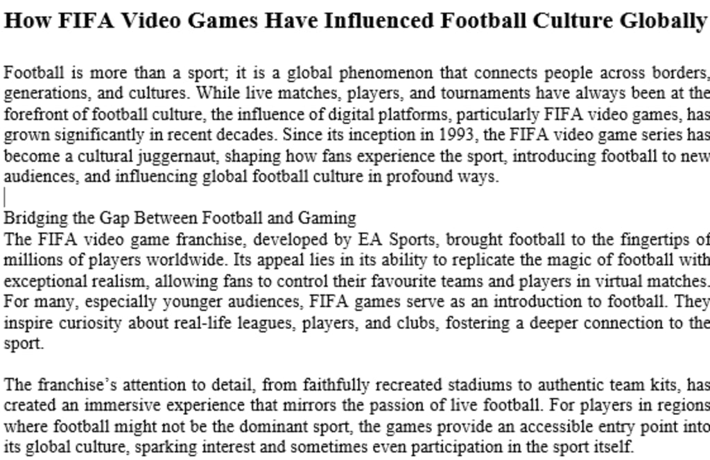 Additionally, the rising costs of the games and required hardware can limit accessibility, particularly in developing regions. While FIFA has undoubtedly brought football to new audiences, its commercial model sometimes hinders its ability to reach all fans equally.