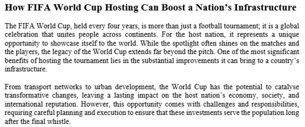 Hosting the FIFA World Cup is an unparalleled opportunity for nations to accelerate their infrastructure development, enhance their global image, and leave a lasting legacy. While the challenges are significant, careful planning and a focus on sustainability can ensure that these investments deliver benefits far beyond the tournament itself.