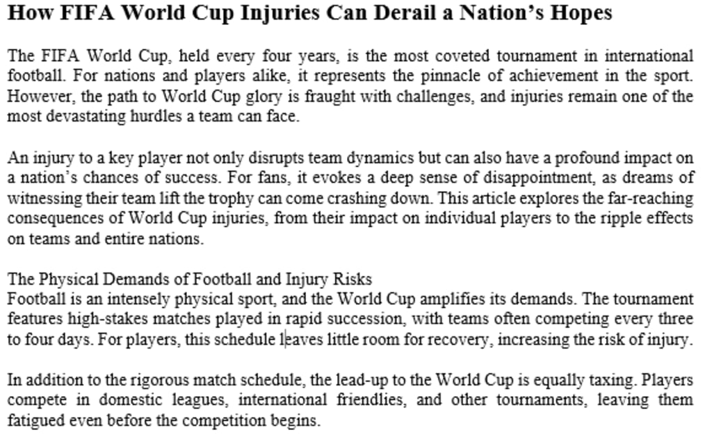 High Intensity: The competitive nature of World Cup matches pushes players to exert maximum effort, increasing the likelihood of strains, sprains, and other injuries.