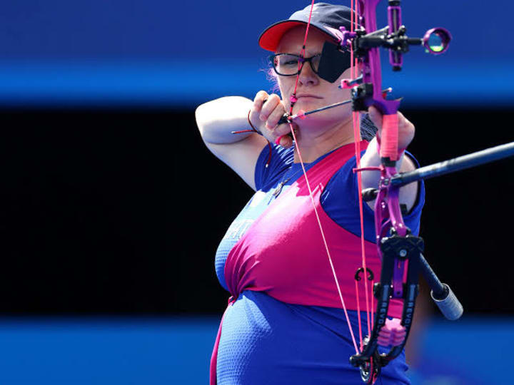 Grinham, easily recognizable with her tall stature, vibrant pink fringe, and long hair dyed blue at the ends, had to make significant adjustments to her technique due to her pregnancy. At seven months pregnant, she had to adapt her equipment and form to accommodate her growing belly. For instance, she wore a low-slung quiver around her middle, which required her to tweak how she lifted and held the bow. She also opted for flat shoes to maintain her balance, as concentration is crucial in archery.