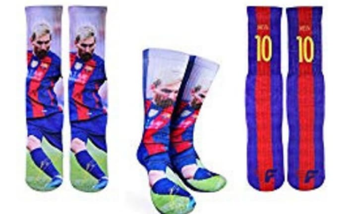 Nothing says “I love Lionel Messi” better than a pair of socks with the soccer player on them. Here, we have a pair of Messi crew socks with a high-quality image of the Barcelona star scoring a goal. On the back of the socks, we have Messi’s name and number, written in a jersey-like manner.