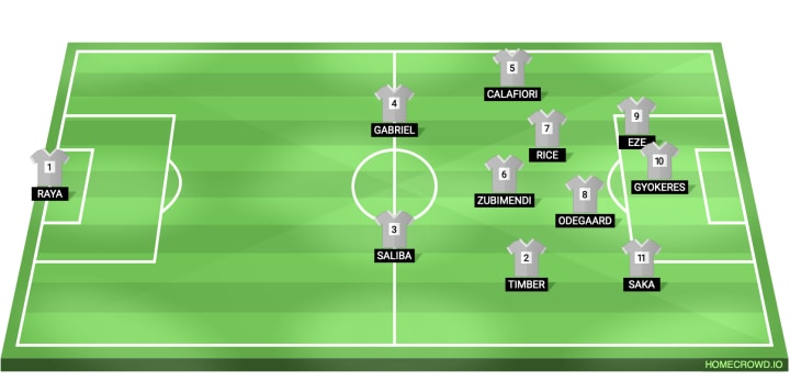 As always you'll have Gabriel and William Saliba sweeping up. Martin Zubimendi will be the metronome player that you can rely on. Declan Rice will make late box darts, but mainly prevent counter attacks. Riccardo Calafiori and Jurrien Timber will rotate between who ventures forward and who doesn't. Martin Odegaard will try and receive between the lines to link Gyokeres to the rest of the team. Bukayo Saka is our sideline attacker, the one who creates width and attacks the box. Viktor Gyokeres is the man in the middle waiting for the time to pounce and finally Eze is the one that will create a box presence and sustain dangerous attacks. If it all clicks together then we have the makings of an extremely potent team.