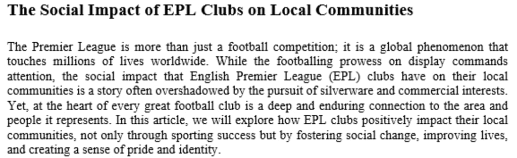In addition, EPL clubs engage in significant charitable work in their local areas. This work often extends beyond football, with initiatives that aim to tackle youth unemployment, provide mental health support, and promote community well-being. The power of football, and by extension EPL clubs, to influence local society for the better cannot be understated.