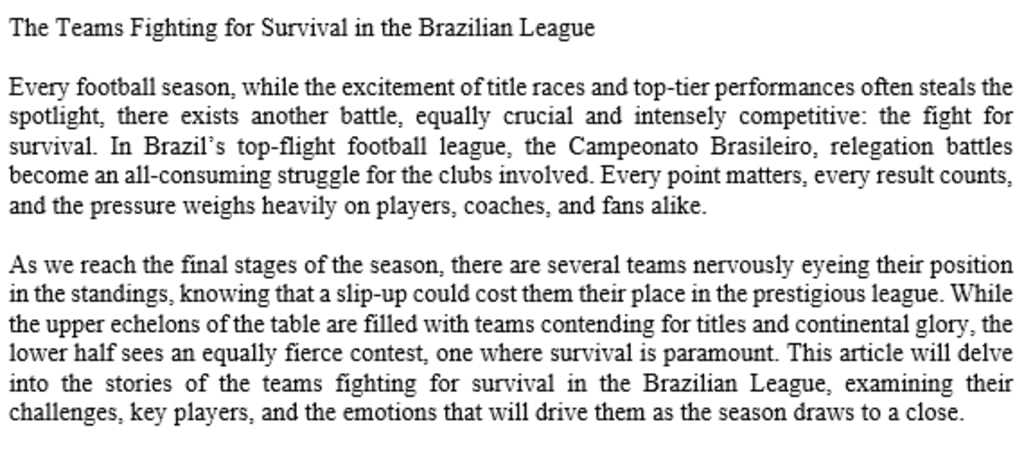 In the end, survival in the Brasileirão is more than just about avoiding relegation; it is a battle to retain the dreams and aspirations that come with playing in Brazil’s most iconic football league. For the teams in the relegation zone, every match will be a chance to prove their worth and ensure that their story in the top tier of Brazilian football continues.