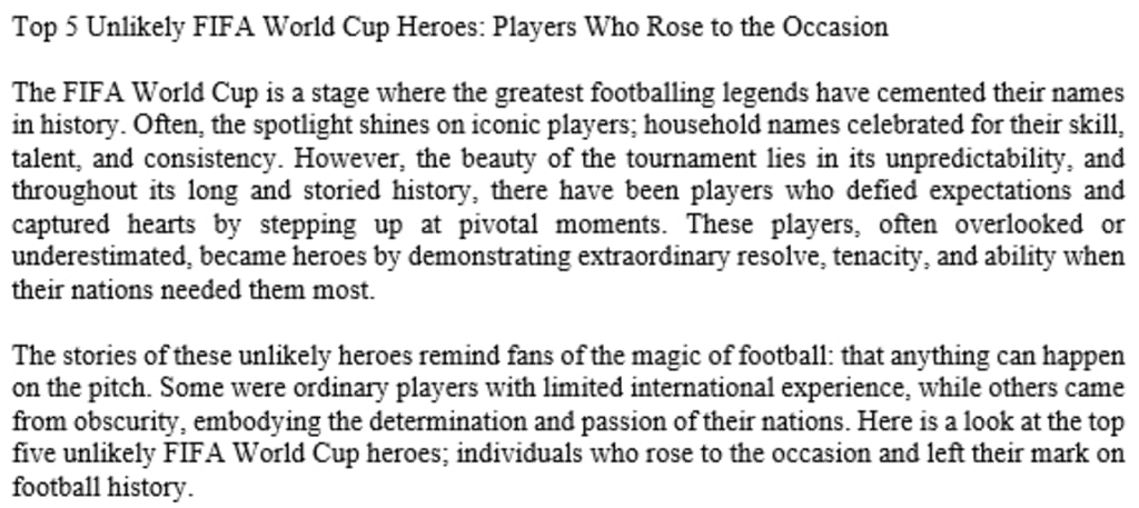 The stories of these unlikely heroes remind fans of the magic of football: that anything can happen on the pitch. Some were ordinary players with limited international experience, while others came from obscurity, embodying the determination and passion of their nations. Here is a look at the top five unlikely FIFA World Cup heroes; individuals who rose to the occasion and left their mark on football history.