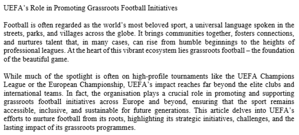 Despite these challenges, UEFA’s grassroots initiatives have already had a profound and lasting impact on football worldwide. Through continued investment in youth development, coaching, and infrastructure, UEFA has helped to establish football as a sport for all, regardless of age, gender, or background.