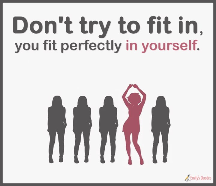 I grew up in an era where books and magazines said to be friendly and talk and dress like others so you would fit in. In today's society teens are encouraged to be themselves. I have always been the one who did not fit in as I was the skinny one, the nervous one, the shy one, the light bright damn near white one, and the awkward one. So now I am finding I might be the only one in my age bracket among my associates who can scale a mountain and walk 4 miles without breaking a sweat and so be it.