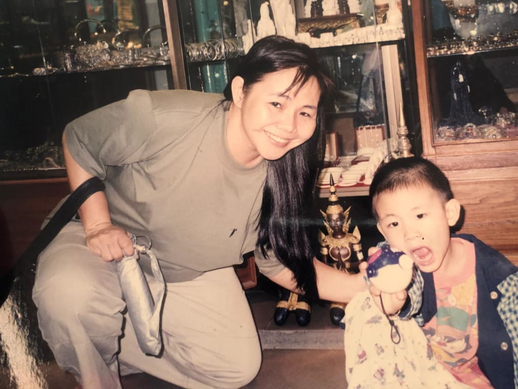 In the end, it was our helper who picked me up. Remember her? We called her Pi Sook, Thai for Sister Joy, and the name we gave her couldn't have been more perfect. The teachers had called the family home, and the helper had picked up because you were too drunk to answer. Instead of being frazzled she, true to her name, was cheerful all the way back, telling me in her broken English to: "No be angry at Mama, boy, no be angry. She just sad..."