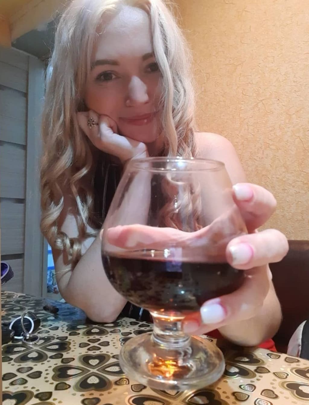 I felt a rush of disappointed, but I knew you were having a good time drinking and getting silly with your friends. It was your birthday, so why shouldn't you get sloppy drunk if you so desired. Now here you were sitting across from me, your beautiful blonde hair slung down across your face, right in your eyes. You made faces as you attempted to blow each strand out of your field of vision. I couldn't help but laugh as you held your glass out before you demanding it to be filled like as if you were a Royal Princess. And really, you were a royal princess. For tonight you were my princess. Yes, there you were, so beautifully drunk awaiting our first kiss.....