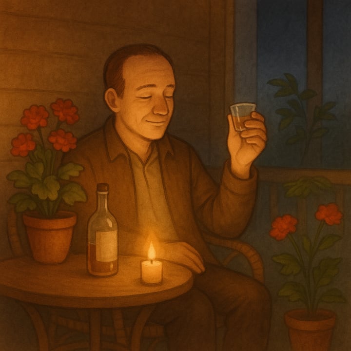 A small candle burns on the table beside the half-finished vodka.