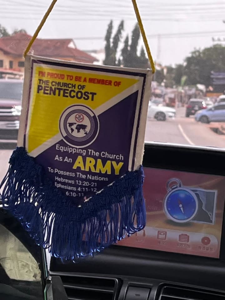 It's him, my phone tells me the driver is one minute away. He pulls up to where I'm standing, he's playing that dreadful, whining Twi gospel music. He can barely see from his front windscreen, it's adorned with a huge yellow & blue from the Pentecost Church.