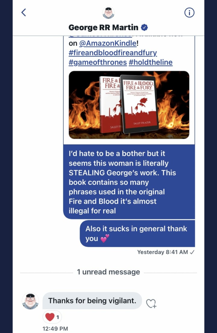 Y’all, they had contacted George R.R. Martin. The George R.R. Martin. Author of the A Song of Ice and Fire series. Creator of the Game of Thrones universe. One Twitter user sent him a message alleging that I had stolen his work.
