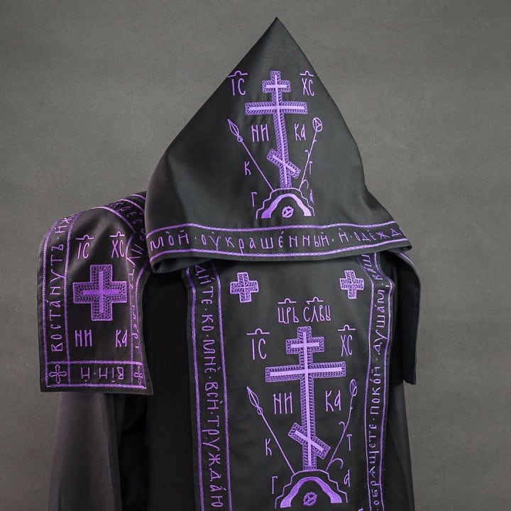 The Great Schema koukoulion is a pointed hood with two long cuts of fabric falling on the chest and back. It is embroidered with crosses, seraphim, and the words of the Trisagion, the 50th Psalm, the hymn "I see Thy Bridal Chamber, O my Savior," or other prayers. Today, koukoulion and the analavos are worn together - a square cloth with an image of an eight-pointed Golgotha cross, the instruments of the Passion, and the skull of Adam. It is noteworthy that after the reform of Patriarch Nikon, the Great Schema koukoulion, unlike other church headdresses, did not undergo changes.