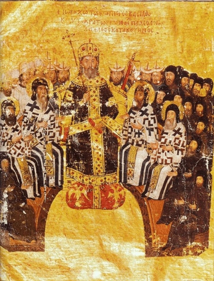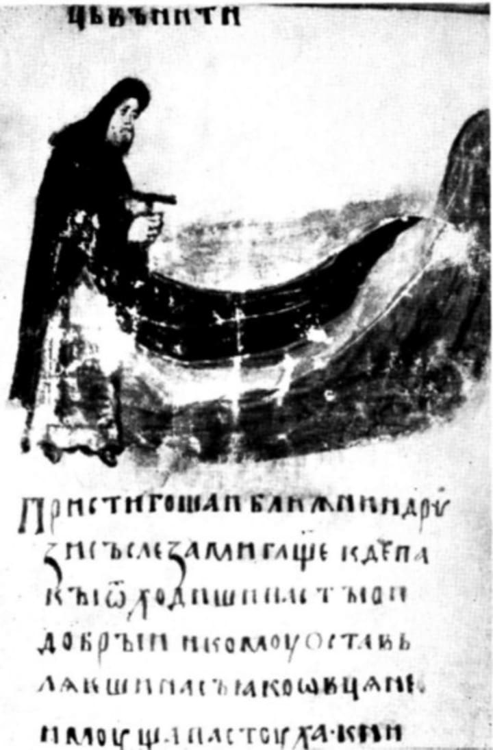 The earliest known images of the klobuk date back to the 14th century, found in the Slavic translation of George Hamartolos chronicle. The klobuk is depicted as a headcloth with veils descending onto the chest and back. Notably, in this miniature St. Athanasius of Alexandria, who lived in the 4th century, was with klobuk. Similar depictions of the klobuk are also found in the miniature images of the "Theological Works" of John VI Kantakouzenos, late 14th century.