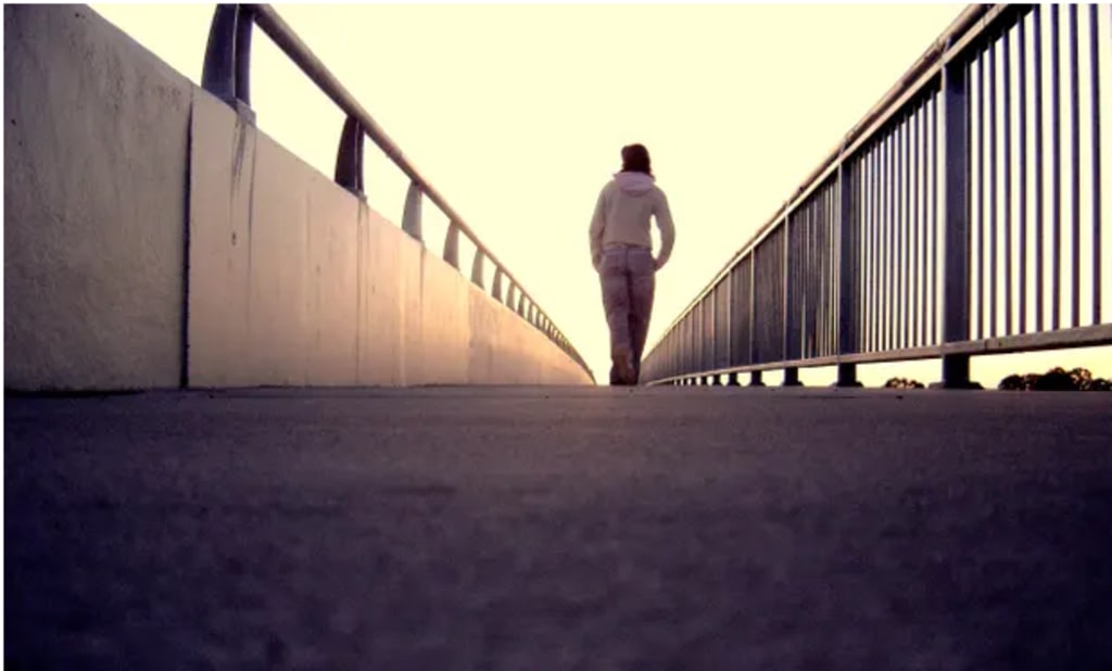 A lonely girl walking along bridge.