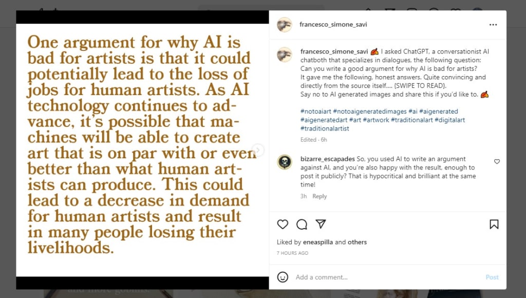 I saw this Instagram post from Francesco Simone Savi and it got me thinking about how AI is seeping into all art creation. Months ago I was alerted to an article where an artist was saying they were under threat from AI generated art. I replied to it is the article below.